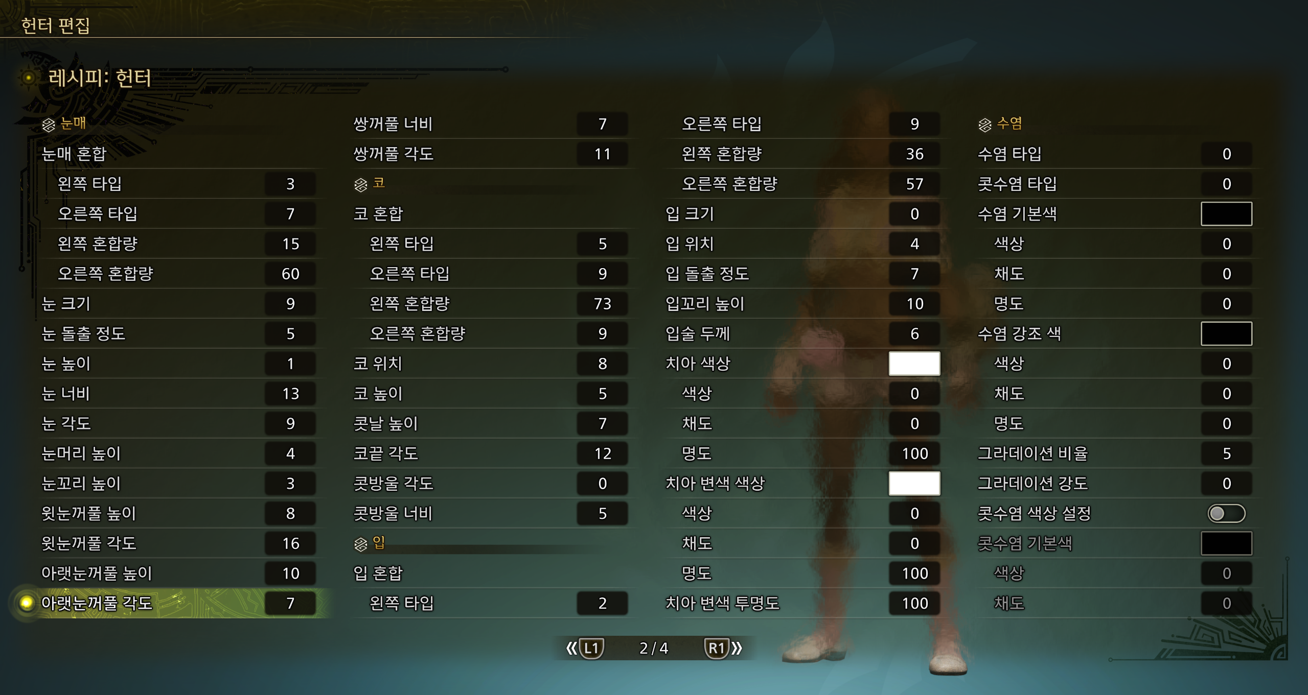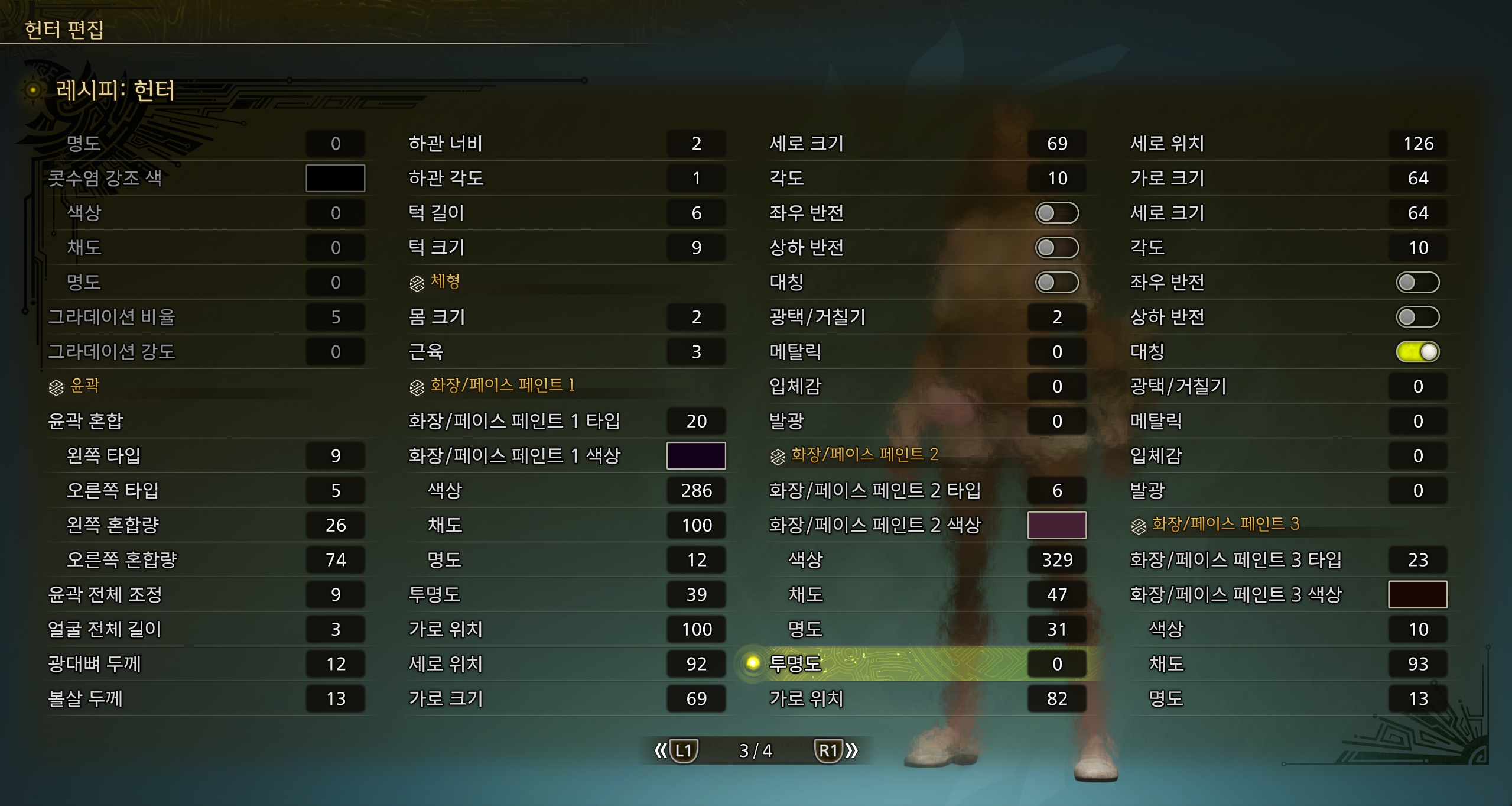 몬스터헌터 와일즈 커스터마이징 준비해 보았습니다. 태닝버전으로 현재 제가 쓰고 있는 커마이고 저의 취향에 맞게 만들었습니다. 나름 만족하고 있는 커미인데요 마음에 드시면 그대로 쓰셔도 되고 취향껏 수정해서 쓰셔도 됩니다.